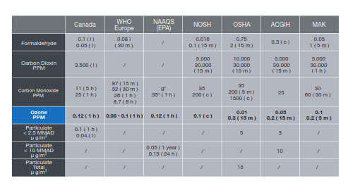 Tabela prikazuje referenčne ravni koncentracij najpogostejših nadzorovanih onesnaževalcev in njihovih virov. Standardi ali normativne reference nimajo vedno enakih "vodilnih vrednot". Treba je opozoriti, da je potrebno vrednosti, prikazane v grafu, obravnavati kot "smernice" ali priporočila, da bi ocenili morebitne negativne učinke, ki jih lahko imajo na zdravje ljudi.